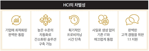 HCI는 서버, 스토리지, 네트워크, 운영체계(OS) 등 IT 인프라 구성에 필요한 모든 요소를 하나의 플랫폼에서 통합 관리하고 유연하게 확장할 수 있다. 따라서 기존 하드웨어 중심의 복잡한 데이터센터 인프라 관리와 낮은 확장성 문제를 해결한다.
