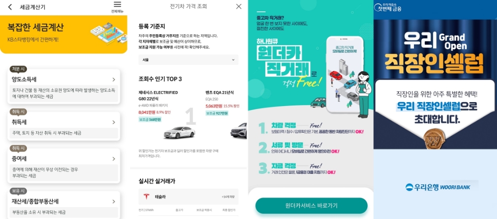 이미지 확대보기13일 시중은행권에 따르면, 은행들은 모바일 앱 기능을 강화하고 있다. 부동산 세금을 예상해서 계산해주는 기능이나 전기차 정보 등을 제공하는 것은 물론 보이스피싱을 방지하는 기능을 탑재한 앱도 등장했다.