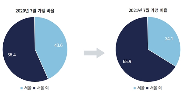 지역별로는 지난해 7월 14일 43.6%에 달했던 서울 가맹 비율이 지난 14일 기준 34.1%로 줄고, 서울 외 지역 가맹 비율이 56.4%에서 65.9%로 크게 늘었다. 서비스 초기 서울에 집중됐던 가맹점이 전국 단위로 확산되고 있어 유의미한 변화를 보이는 것으로 나타났다.