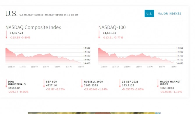 뉴욕증시는 지난 주말 소매판매 강세와 양호한 기업 실적에도 인플레이션 우려로 하락했다. 다우지수는 299.17포인트(0.86%) 하락한 3만4687.85에 마감했다. S&P500지수는 32.87포인트(0.75%) 떨어진 4327.16로 끝났다. 기술주의 나스닥지수는 115.90포인트(0.80%) 밀린 1만4427.24에 마쳤다. 미시간대 7월 소비자심리지수가 80.8로 전월 확정치인 85.5보다 하락했다. 경기회복에 대한 소비자들의 신뢰도가 약화했다는 의미다. 미시간대 소비자심리지수는 소비자들의 경제 체감도와 소비 의지를 보여주는 미국의 대표적인 지수이다. 미국 상무부는 6월 소매판매가 0.6% 늘었다고 발표했다.