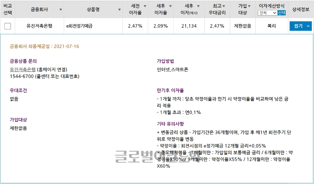 해당 상품은 유진저축은행의 정기예금(12개월, 24개월, 36개월 기준)인 'e회전정기예금(2.47%)', 'e정기예금(2.42%)'이다.