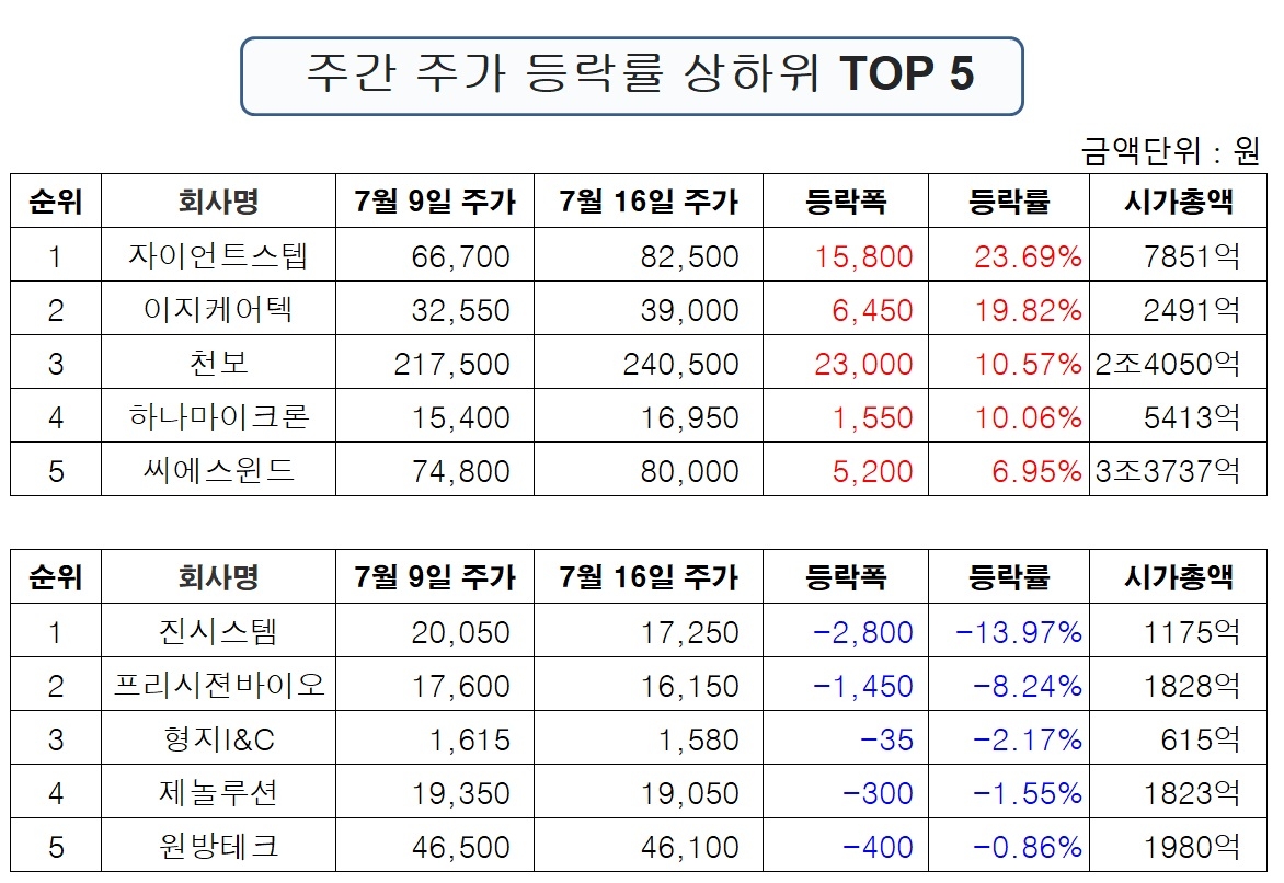 1위 자이언트스텝 8만2500원 +15800원 (23.69%), 2위 이지케어텍 3만9000원 +6450원 (19.82%), 3위 천보 24만500원 +23000원 (10.57%), 4위 하나마이크론 1만6950원 +1550원 (10.06%), 5위 씨에스윈드 8만 원 +5200원 (6.95%)