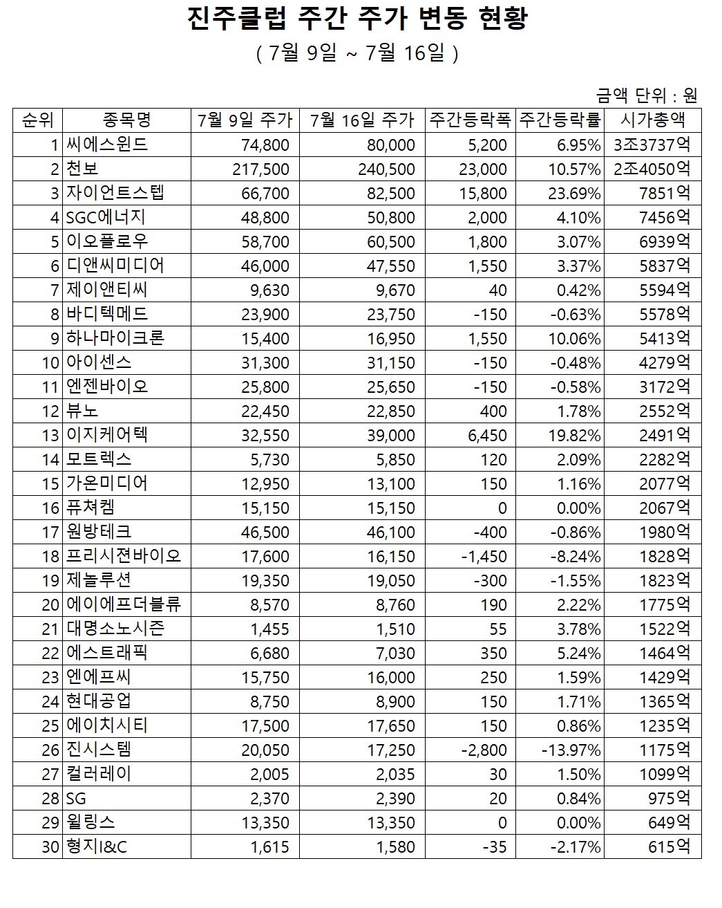 이미지 확대보기'진주클럽'의 주간 기준 주가 상승률 상위 5개 기업은 다음과 같다.