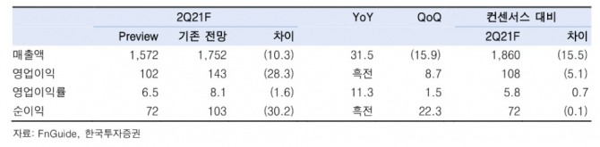 김 연구원은 "차량용 반도체 부족으로 주요 고객사들의 가동률이 하락했다"면서 "미국 등 주요 국가의 자동차 시장 회복세는 지속됐지만 매출비중 13%로 두번째 주요 고객사인 포드의 2분기 생산이 절반 수준으로 줄었기 때문"이라고 설명했다.