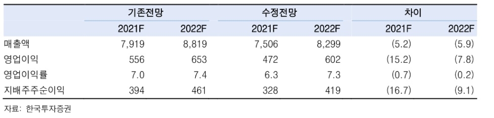 한투증권은 한온시스템의 연간 매출액을 7조5060억 원, 영업이익 47020억 원, 지배주주 순이익 3280억 원으로 소폭 하향조정했다. 당초 기전망에서는 각각 7조9190억 원, 5560억 원, 3940억 원을 예상했다.