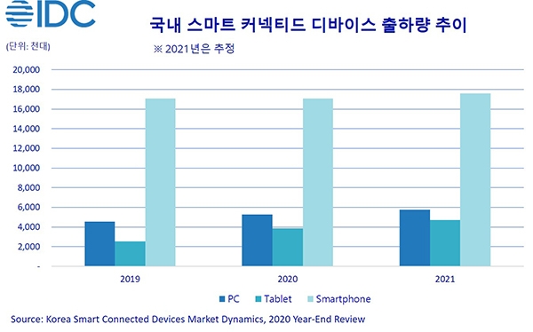 인터내셔날데이터코퍼레이션코리아(이하 한국IDC)는 최근 발간한 '국내 스마트 커넥티드시장 보고서'에서 지난해 국내 스마트 커넥티드 디바이스 시장이 전년 대비 8.5% 성장한 2619만대 출하 기록을 달성했다고 20일 밝혔다.이번 보고서는 PC, 태블릿, 스마트폰을 포함한 스마트 커넥티드 디바이스 시장 현황과 업계 동향, 그리고 올해 미래 전망을 제시한다.