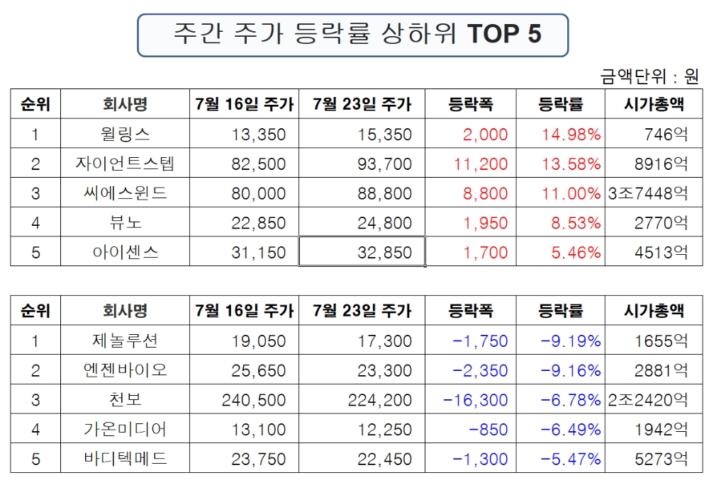 1위 윌링스 1만5350원 +2000원 (14.98%), 2위 자이언트스텝 9만3700원 +11200원 (13.58%), 3위 씨에스윈드 8만8800원 +8800원 (11%), 4위 뷰노 2만4800원 +1950원 (8.53%), 5위 아이센스 3만2850원 +1700원 (5.46%)