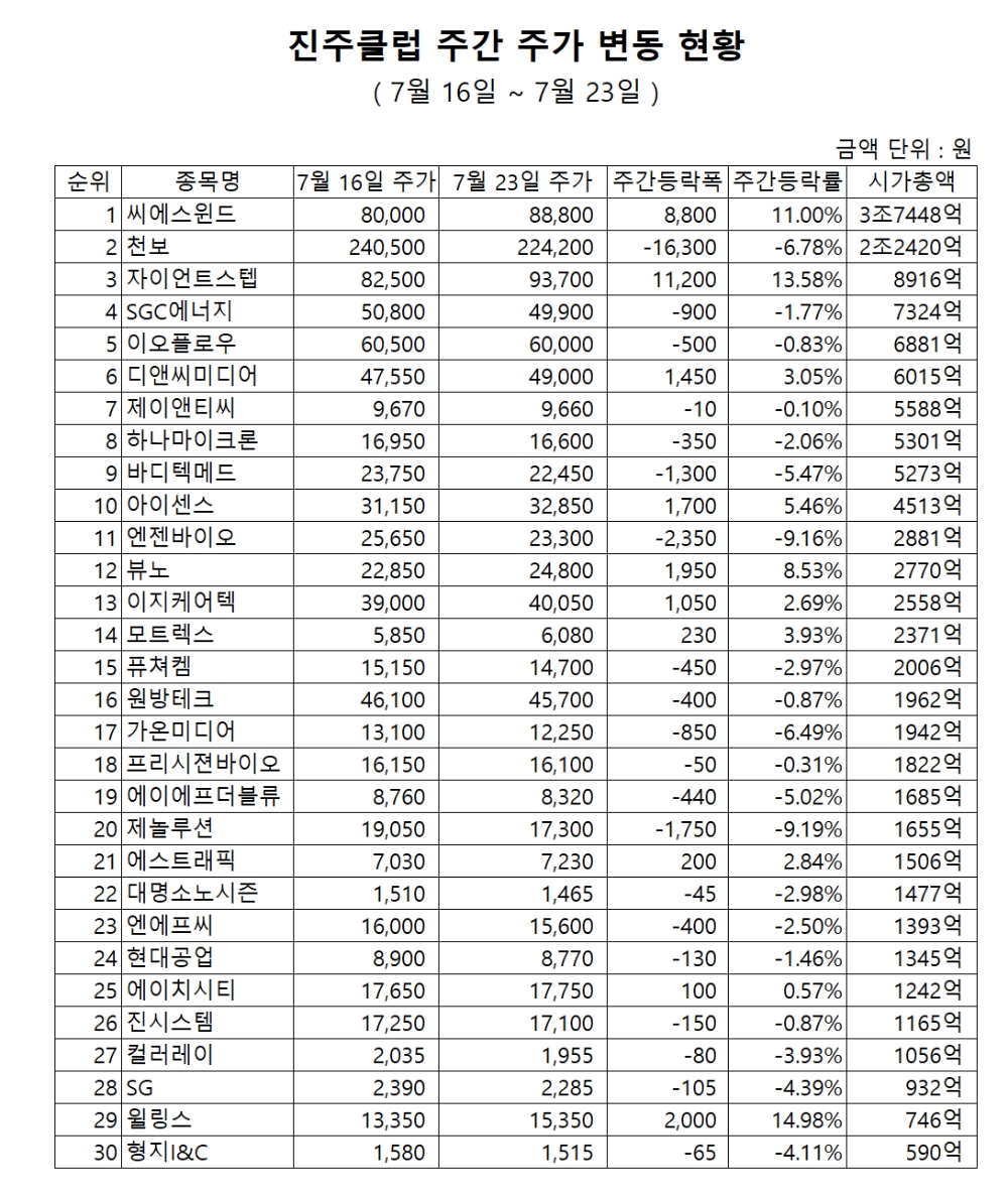 이미지 확대보기'진주클럽'의 주간 기준 주가 상승률 상위 5개 기업은 다음과 같다.