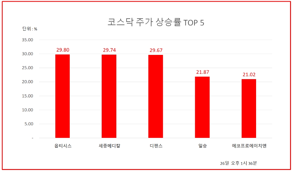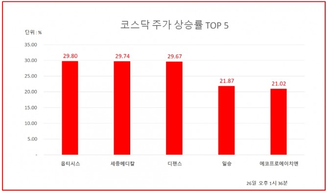 1위 옵티시스 28750원 ( 29.8% ), 2위 세종메디칼 17450원 ( 29.74% ), 3위 디젠스 1285원 ( 29.67% ), 4위 일승 3845원 ( 21.87% ), 5위 에코프로에이치엔 391000원 ( 21.02% ), 6위 노랑풍선 19900원 ( 18.45% ), 7위 아모센스 15550원 ( 17.36% ), 8위 비덴트 11350원 ( 15.7% ), 9위 삼성스팩2호 10200원 ( 14.35% ), 10위 위즈코프 3710원 ( 14.33% )