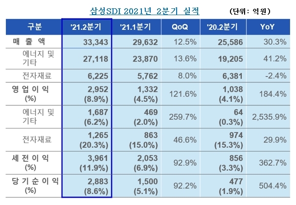 이미지 확대보기삼성SDI는 올해 2분기 실적이 매출 3조3343억 원, 영업이익 2952억 원을 기록했다고 27일 밝혔다.