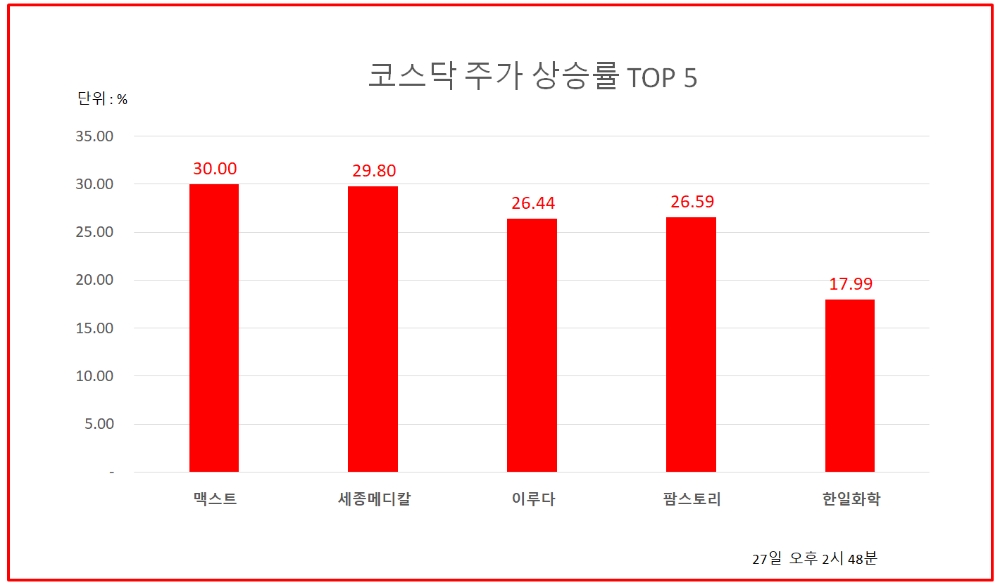 1위 맥스트 39000원 ( 30% ), 2위 세종메디칼 22650원 ( 29.8% ), 3위 이루다 16500원 ( 26.44% ), 4위 팜스토리 2880원 ( 26.59% ), 5위 한일화학 19350원 ( 17.99% ), 6위 조아제약 4815원 ( 14.78% ), 7위 홈캐스트 4010원 ( 13.12% ), 8위 한국비엔씨 13900원 ( 13.01% ), 9위#대아티아이 6680원 ( 12.84% ), 10위#아난티 10750원 ( 13.28% )