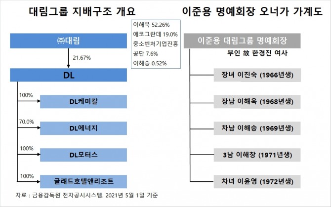 이준용 명예회장의 차남인 이해승 씨가 지분 0.52%(5만4628주)를 갖고 있고 대림의 친족이 지분 52.78%(555만6307주)를 보유하고 있습니다. 사실상 대림그룹은 사실상 이해욱 회장의 지배하에 놓여 있다고 할 수 있습니다.
