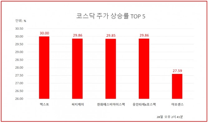 28일 오후 2시 41분 현재 코스닥 상승률 상위 50개 종목은 다음과 같다.