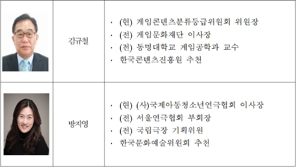 위촉된 위원은 김규철 게임콘텐츠분류등급위원회 위원장, 방지영 국제아동청소년연극협회 이사장이다.