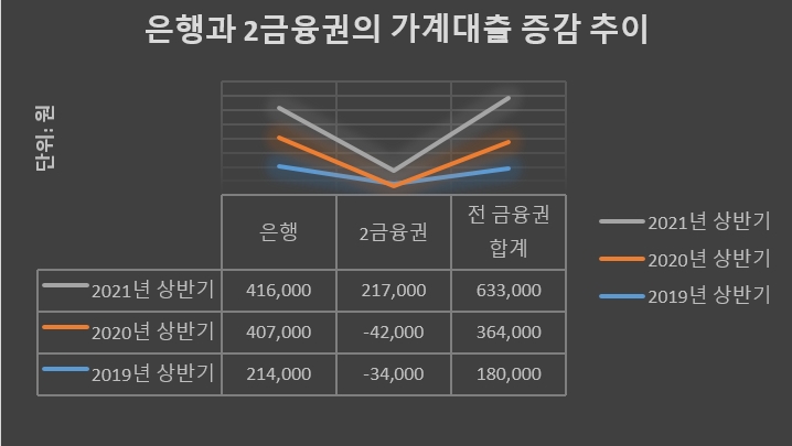 이미지 확대보기30일 금융권에 따르면 올해 상반기 제2금융권 가계대출은 21조7000억원 증가했다. 지난해 상반기 2금융권 가계대출이 지난해 말에 비해 4조2000억원 줄었다는 점을 감안하면 전례 없는 수준으로 가계대출 규모가 폭증한 것이다.