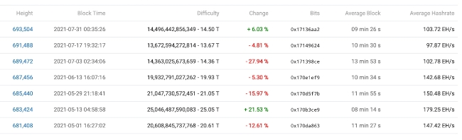 7월 31일 블록 높이 693,504에서 비트코인 블록체인의 난이도는 네트워크에 얼마나 많은 해시 파워가 할당되었는지에 따라 조정됐다. BTC 체인 전용 해시 레이트가 많을수록 2주마다 난이도가 높아진다. 반면에 많은 채굴자가 오프라인 상태가 되고 전용 해시 레이트가 떨어지면 난이도가 낮아져 채굴 참가자가 BTC 블록을 찾기가 더 쉬워진다. 비트코인의 난이도는 블록 높이 693,504에서 변화를 보았고 8주 연속으로 난이도가 54% 이상 하락한 후 6.03% 증가했다.