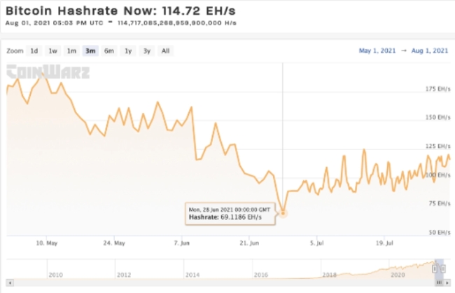 이미지 확대보기기사 작성 당시 해시 레이트는 일요일에 약 114EH/s에서 초당 100 엑사해시(EH/s)로 떨어졌다. 이는 33일 전인 6월 28일의 90일 기록 통계에 따르면 해시 레이트가 69EH/s로 떨어졌을 때보다 훨씬 개선된 것이다. 해시레이트의 하락으로 블록 높이 689,472에서 난이도가 27.94% 감소했다.
