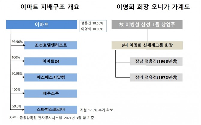 이명희 회장은 지분 10.0%(278만7582주)를 보유한 특수관계인입니다. 이 회장은 지난해 9월 정 부회장에게 지분 8.52%(229만2512주)를 증여해 지분을 10%로 낮췄습니다.