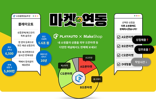 이번에 오픈한 마켓 연동은 코리아센터의 메이크샵이 국내 1위 쇼핑몰 마켓연동 전문기업 플레이오토와 협력해 온라인 사업자들의 판로 확대를 지원하는 서비스다. 플레이오토는 6500여곳의 고객사와 누적 판매 상품수 5800만, 연간 거래액은 5조 6000억원에 달한다.