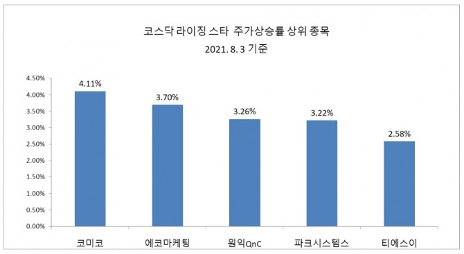 '2021년 코스닥 라이징스타' 종목 중 이날 가장 주가상승률이 뛰어난 종목은 코미코다.