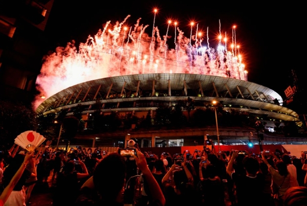 많은 일본시민들이 지난 23일(현지시간) 일본 도쿄 올림픽경기장에서 개막식 불꽃놀이를 경기장밖에서 구경하고 있다. 사진=로이터