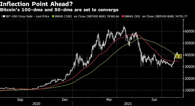 한편, 비트코인은 곧 변곡점 근처로 접근할 것으로 보이며 100일 이동 평균, 최근 가격 및 50일 이동 평균에 수렴할 것으로 보인다.