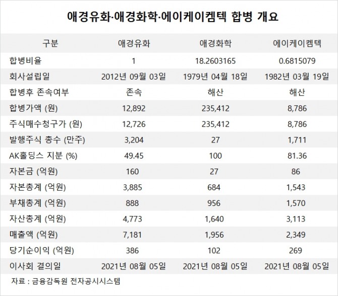애경유화, 애경화학, 에이케이켐텍의 합병이 성사되면 애경유화에 대한 AK홀딩스의 지분이 늘어나 지배력은 강화되지만 애경유화 소액주주들은 경영권 분쟁이나 인수합병 가능성이라는 재료를 잃게 돼 상대적으로 상실감을 맛볼 수 있습니다.