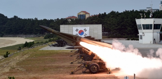 중거리 지대공 유도무기 호크가 발사되고 있다. 사진=LIG넥스원