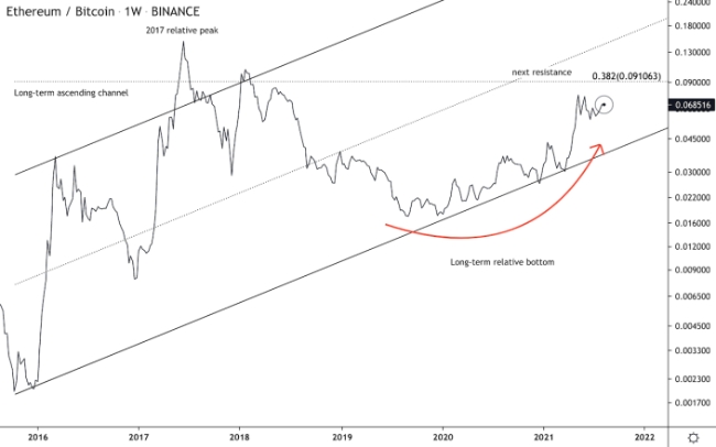 위의 차트는 지난 2년 동안 강력한 지원을 제공한 ETH/BTC의 장기 오름차순 채널을 보여준다. 2018년 암호화폐 약세장에서 비트코인과 비교해 이더리움의 실적이 상대적으로 저조했지만, 두 번째로 큰 암호화폐는 최근 2016년과 유사한 상승세를 보여주고 있다.