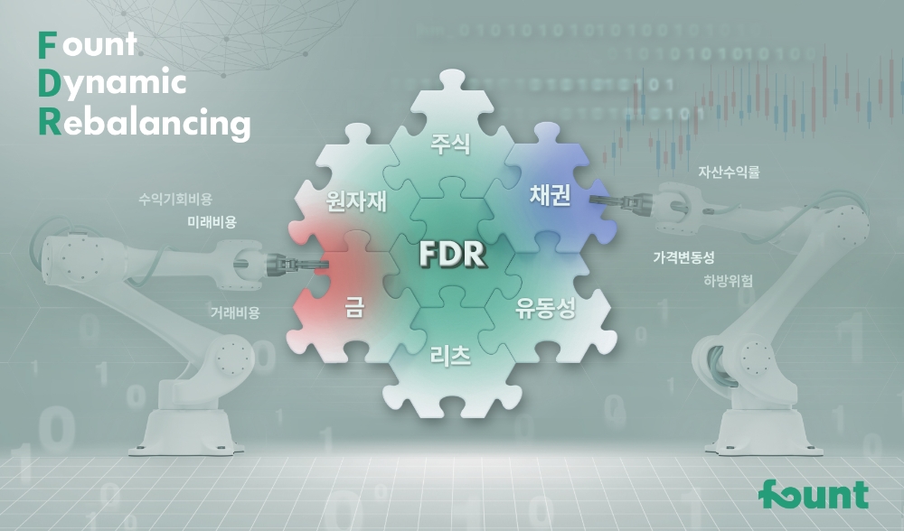 파운트 투자일임 서비스의 가장 큰 경쟁력 중 하나는 파운트 다이내믹 리밸런싱(FDR. Fount Dynamic Rebalancing)이다. FDR은 매월 혹은 매년 정해진 날짜에 진행하는 정기 리밸런싱과 달리 시장 상황에 따라 리밸런싱 여부가 결정되는 수시 리밸런싱 방식이다. 고정 밴드 방식이 아닌 시장 상황이나 개별 투자자의 평가 등에 따라 리밸런싱 신호의 밴드가 바뀐다는 점에서 차별화된다.