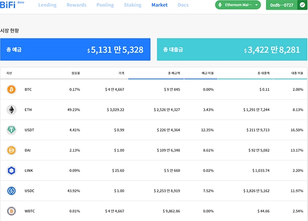 현재 바이파이는 이더리움(ETH), 테더(USDT), 유에스디씨(USDC), 바이낸스코인(BNB), 다이(DAI), 체인링크(LINK), 비트코인 BEP2(BTCB), 비유에스디(BUSD), 랩비트코인(WBTC) 등을 거래하고 있으며, 예치금(TVL·Total Value Locked) 및 대출금액, 풀링·스테이킹 금액 등을 합친 총 거래액은 9200만 달러(한화 1000억원)를 넘어섰다.