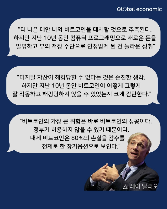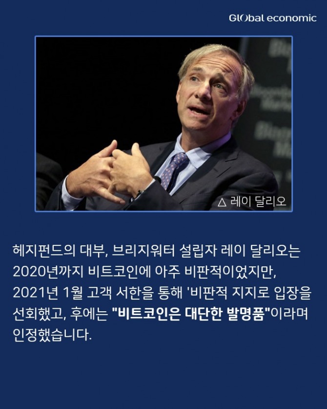 헤지펀드의 대부, 브리지워터 설립자 레이 달리오는 2020년까지 비트코인에 아주 비판적이었지만, 2021년 1월 고객 서한을 통해 '비판적 지지로 입장을 선회했고, 후에는 "비트코인은 대단한 발명품"이라며 인정했습니다.