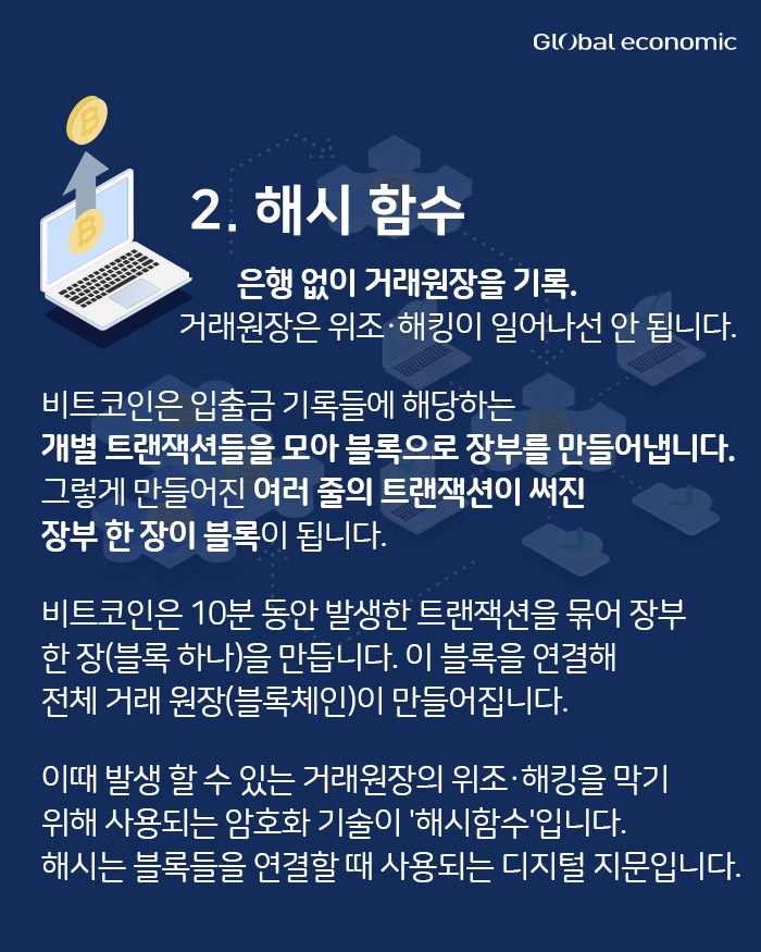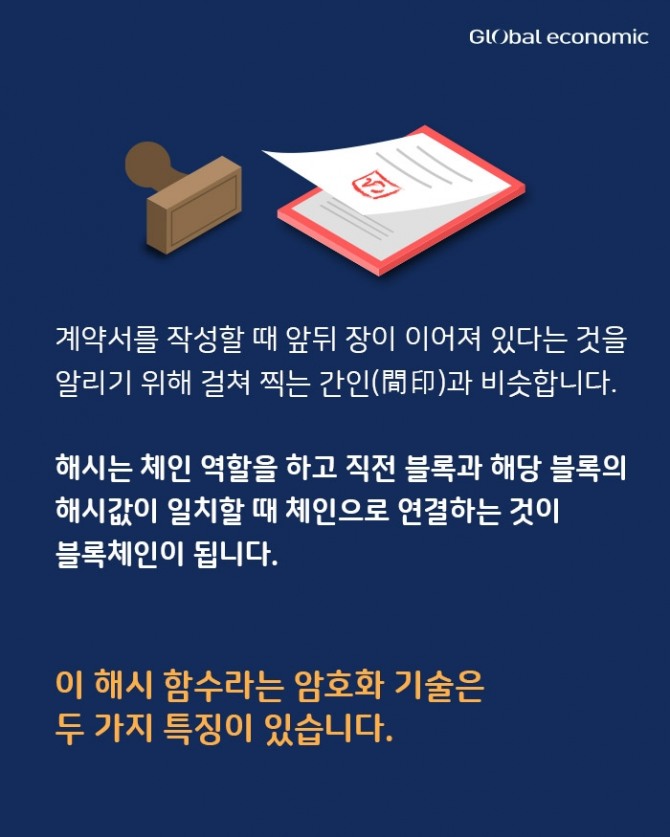 이때 발생 할 수 있는 거래원장의 위조·해킹을 막기 위해 사용되는 암호화 기술이 '해시함수'입니다. 해시는 블록들을 연결할 때 사용되는 디지털 지문입니다.