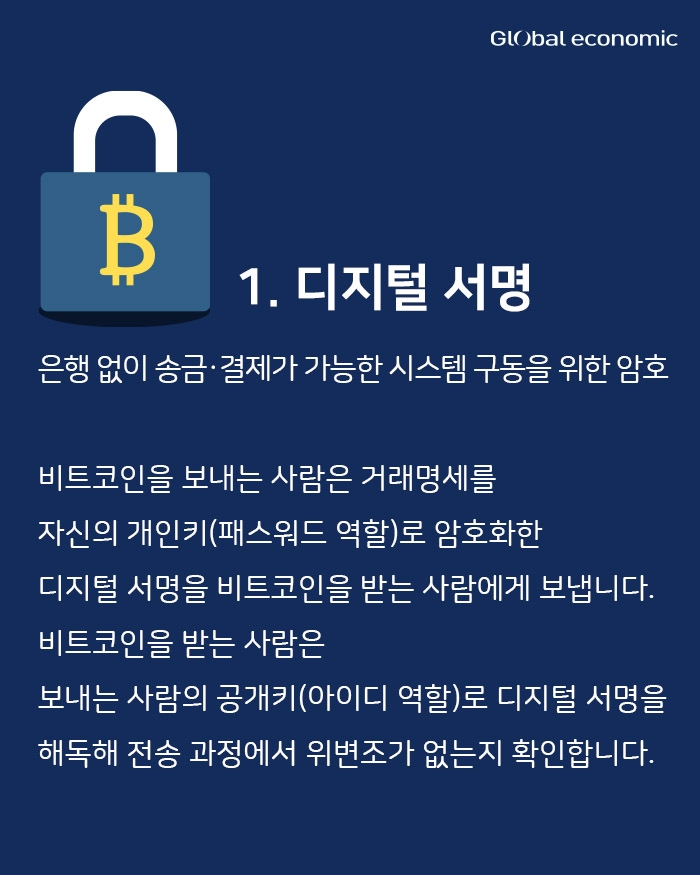 비트코인을 보내는 사람은 거래명세를 자신의 개인키(패스워드 역할)로 암호화한 디지털 서명을 비트코인을 받는 사람에게 보냅니다.