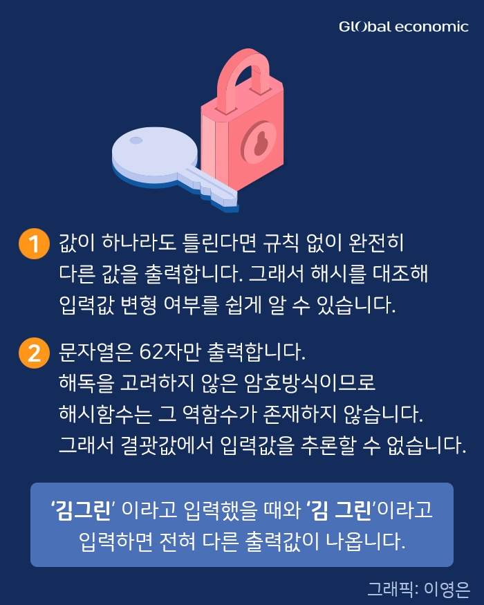 1. 값이 하나라도 틀린다면 규칙 없이 완전히 다른 값을 출력합니다. 그래서 해시를 대조해 입력값 변형 여부를 쉽게 알 수 있습니다.