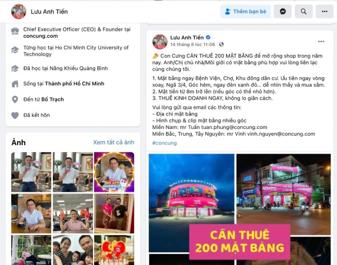 26일(현지시간) 베트남 현지매체 비엣남비즈(VietnamBiz) 등에 따르면 콘쿵의 루 티엔 아잉(Luu Tien Anh)대표이사는 개인 페이스북에 올린 게시물을 통해 "올해 체인을 확장하기 위해 전국에서 매장으로 임대할 장소 200곳을 찾고 있다. 임대할 공간에 대한 요구에는 병원, 시장, 3교차로, 4교차로와 같은 인구밀도가 높은 구역에 위치하고 전면이 8미터 이상등이 여러 조건이 있다."고 밝혔다.
