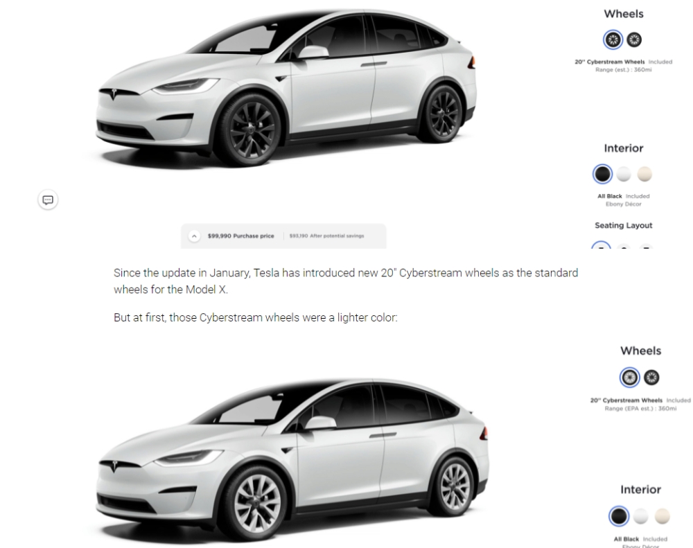 구형 휠을 탑재한 테슬라 모델X(아래)와 신형 휠을 탑재한 테슬라 모델X. 사진=테슬라
