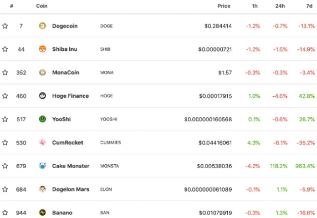 암호화폐 세계를 폭풍으로 몰아넣은 또 다른 밈 자산은 시바 이누(SHIB)다. 12개월도 채 되지 않아 875만%라는 엄청난 수익을 올리며 도지코인의 이익을 앞질렀다. 그러나 DOGE와 마찬가지로 SHIB는 지난 7일 동안 14.8% 하락했다. SHIB는 지난 30일 동안 16.6%만 올랐으며 기사 작성 시점에서 단위당 0.00000721달러에 손을 바꿨다. DOGE의 시가 총액이 370억 달러이고 SHIB의 시가 총액이 35억 달러이므로 이 두 암호화폐 자산은 시가 총액 측면에서 가장 큰 밈 기반 암호화폐다.