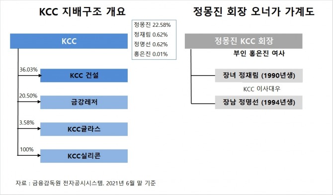 정 회장의 장녀 정재림 KCC 이사대우와 장남 정명선 씨가 각각 지분 0.62%(5만5468주)를 소유하고 있습니다. 정 회장의 부인 홍은진 씨가 지분 0.01%(502주)를 갖고 있습니다.