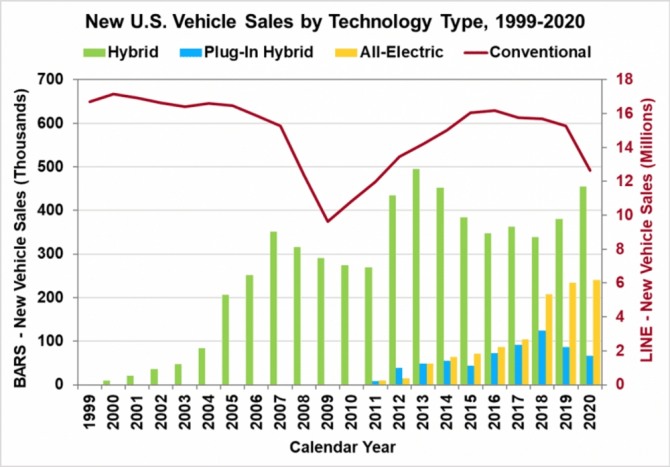 순수 전기차의 약진이 시작된 것은 2018년부터. 그 결과 신종 코로나바이러스(코로나19) 사태가 급습한 지난해의 미국내 신차 판매량은 1500만대도 넘기지 못하는 불경기를 기록했다.