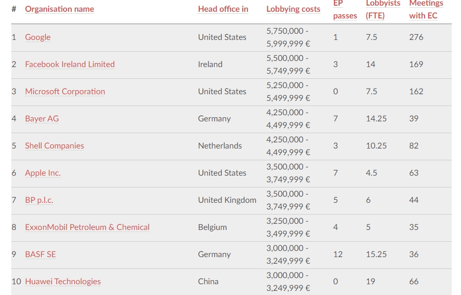 로이터에 따르면 시민단체 유럽기업관측소(CEO)와 로비컨트롤은 공동으로 운영하는 기업 로비감시 정보 플랫폼 ‘로비팩트’에 최근 올린 보고서에서 구글이 매년 EU 지역에서 집행하는 로비 자금이 575만유로(약 79억원)에 달해 1위를 기록했다. 페이스북이 550만유로(약 75억원), MS가 525만유로(약 72억원)로 그 뒤를 이었다.