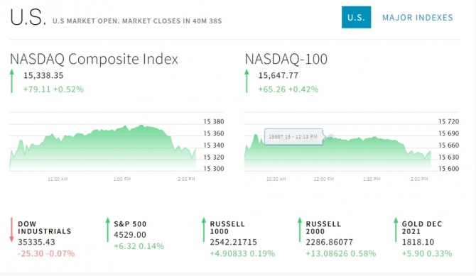 국채금리 하락으로 기술주들이 오르면서 나스닥 지수는 또 장중 최고치를 경신했다.