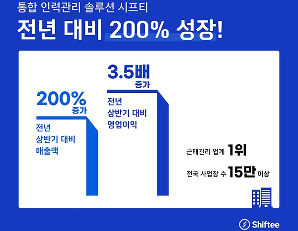 통합 인력관리 솔루션 시프티(대표 신승원)가 상반기 매출이 전년 동기 대비 200% 증가했다고 6일 밝혔다. 해당 기간 영업이익은 전년 대비 3.5배 증가했다.