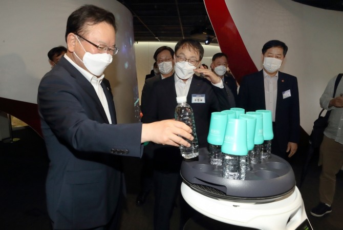 KT는 청년 구직자를 대상으로 AI 무상교육 ‘디지코 KT AI 혁신스쿨(가칭)’ 프로젝트를 추진한다고 7일 밝혔다. 간담회에는 김부겸 국무총리, 구윤철 국무조정실장, 오영식 국무총리 비서실장, 윤성욱 국무조정실 제2차장, 박화진 고용노동부 차관, KT 구현모 대표이사가 자리했다. 사진은 김부겸 국무총리가 KT AI 서빙로봇이 배달한 생수를 들고 있는 모습. 사진=KT이미지 확대보기