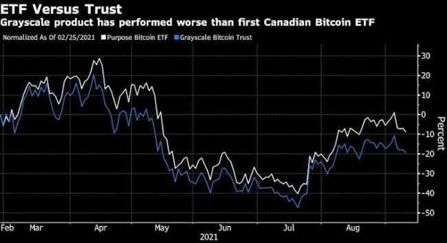ARKW는 이미 비트코인 노출을 하고 있으며 블룸버그가 수집한 데이터에 따르면 펀드의 약 5.5%가 그레이스케일 비트코인 트러스트(GBC)에 투자된다. 300억 달러의 이 펀드는 틀림없이 투자자가 미국에서 암호화폐에 접근하는 가장 쉬운 방법이지만, 그 구조는 비효율적이며 그 가치는 보유하고 있는 비트코인의 가치와 자주 분리된다.