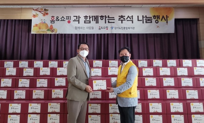 홈앤쇼핑은 13일 추석을 맞아 강서어르신종합복지관을 방문해 홀몸어르신 약 500명에게 명절 식품 행복꾸러미를 전달했다고 14일 밝혔다. 행복꾸러미는 어르신들이 손쉽게 조리할 수 있는 ▲밀키트 ▲송편 ▲과일 등으로 구성했다.