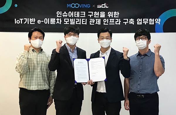 이미지 확대보기무빙(대표 이상명)은 지난 15일 SDT 주식회사(대표 윤지원, 이하 SDT)와 '인슈어테크 구현을 위한 e-이륜 바이크 관제 인프라 구축 업무 협약식'을 체결했다고 16일 밝혔다.