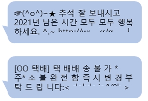 이미지 확대보기17일 금융업계에 따르면 올해 8월까지 스미싱 신고(접수)·차단 건수는 18만4002건으로 전년 동기 대비 74% 감소했다. 그러나 추석 명절 기간 선물 배송 등에 악용될 수 있는 택배 사칭 스미싱 유형이 93%를 차지하고 있어 이용자의 각별한 주의가 요구된다.