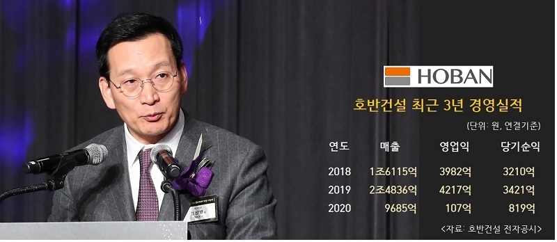 호반건설의 지난해 매출액은 약 9685억 원으로, 지난 2012년 이후 처음 1조 원을 밑돌았다. 2019년(2조4836억 원)보다 61% 줄어든 수치다.
