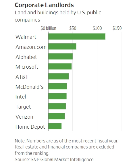 S&P 글로벌마켓인텔리전스에 따르면 미국 대기업들이 현재 보유한 부동산과 토지는 1조6400억달러(약 1943조원)에 이른다. 이는 10년전과 비교하면 38%나 크게 증가한 규모일뿐 아니라 최근 10년 사이 가장 많은 규모다.